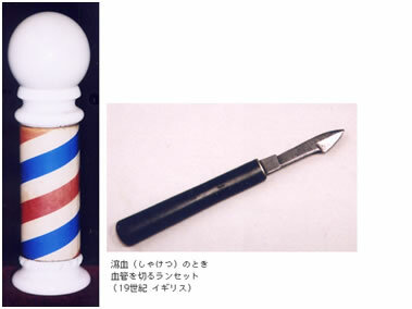 中世の頃、理髪師は修道院などにいて、髪やひげを切るだけでなく、瀉血(しゃけつ)や民衆の求めに応じて、火傷や骨折などの治療、抜歯などの外科的治療も行うようになっていました。そのため、当時は理髪外科医と呼ばれていたようです。 瀉血とは、患者の静脈から血を少しだけ抜き出す治療のことです。今でこそ、こんな治療法はほとんど行われていないが、昔はこの瀉血が健康維持や病気の治療のためには、『悪い血を抜かなくてはならない』と信じられており、盛んに行われていました。